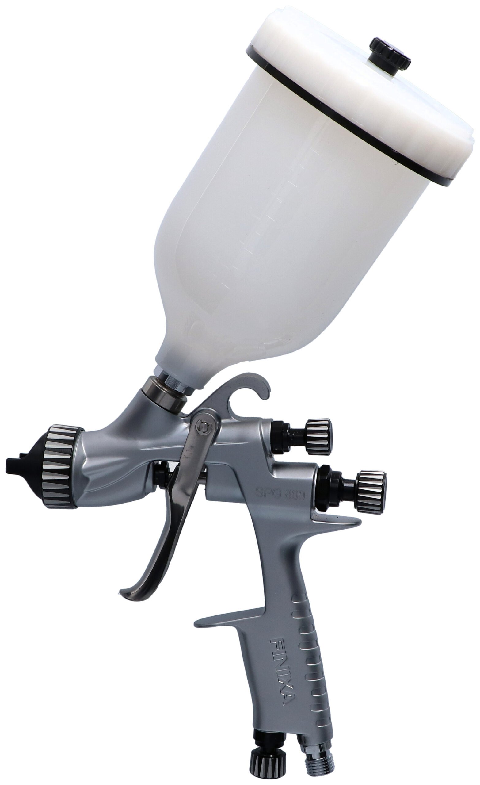 SPG 80 on 10L tankin ja 10 metrin ilma/maaliletkun yhdistelmä, joka soveltuu erinomaisesti kammionsuoja-aineiden ruiskutukseen. Tukeva rakenne ja kompakti muotoilu. Painesumutuspistooli varustettuna painemittarilla ja nestepaineen säätimellä tarkkaa asetusten säätöä varten. Kahden 10 metrin mittaisen letkun setti mahdollistaa helpon liikkumisen ja toiminnan sumutuspistoolilla ilman säiliön siirtämistä. Erinomainen suurille alueille, kuten busseille, kuorma-autoille ja pakettiautoille tai maalauskoppien kabinettisuojaustuotteiden suihkuttamiseen. Vaihtoehtoiset 1,2 mm – 1,5 mm – 2,0 mm neulasarjat saatavilla. Tekniset tiedot: Maalausmenetelmä: paineensyöttö Säiliön tilavuus: 1000CC Työpaine: 1,99 bar (29PSI)Ilman sisääntuloliitäntä: 1/4nps Säiliön liitin: 3/8nps Keskireikäpaine: 0,67 bar (10PSI) Suuttimen koko: 1.8mm Suutintyyppi: yksiosainen Ilman kulutus: 175L/min Maalin virtaus: 120cc/min Sumutusetäisyys: 18cm Sumutusleveys: 15-20cm Pistoolin runkomateriaali: valuraudasta valmistettu Suuttimen materiaali: teräs Neulan materiaali: teräs Korkin materiaali: messinki Maksimisäiliön paine: 5.5 bar (80PSI)